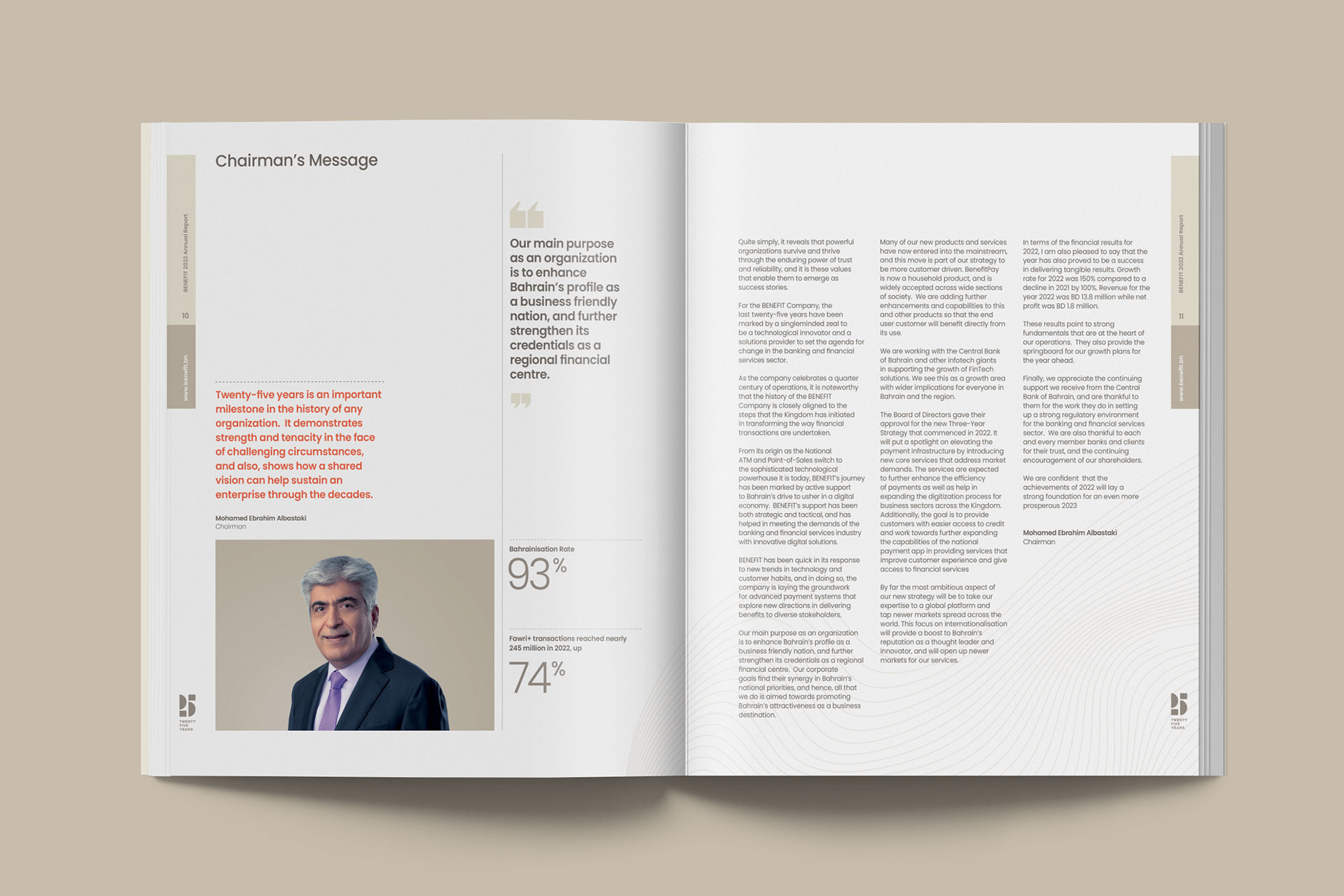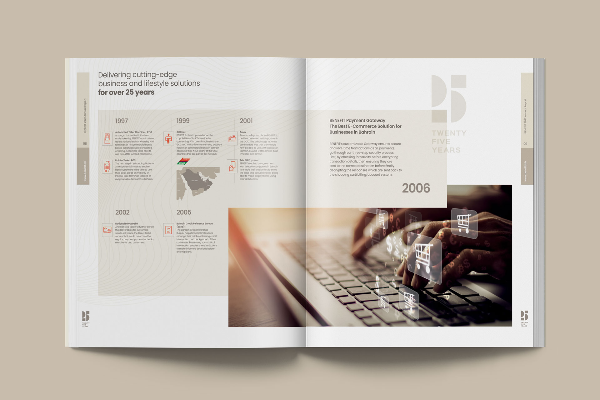 Keeping pace with Bahrain’s rapid growth, Benefit has equally progressed over the years to deliver cutting edge products and services. With each advancement, it has continued ‘Shaping the future of society for 25 years’. Tasked with designing and producing their 2022 Annual Report, Miracle captured their stellar financial performance, major milestones, and leaps forward in an elegant bilingual publication.