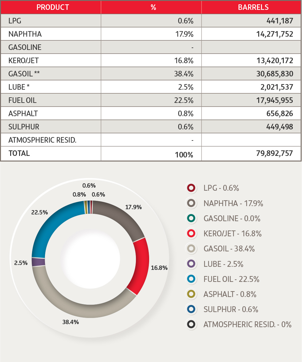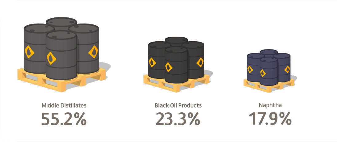 In 2022, a total of 79.89 million barrels of products were exported, with middle distillates accounting for 55.2% of sales. Black oil products (Fuel Oil and asphalt) followed at 23.3% and Naphtha at 17.9%.