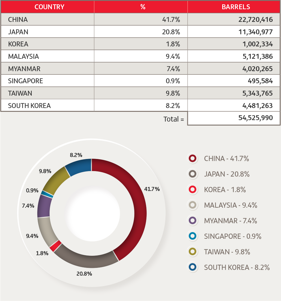 Bapco markets the Government of Bahrain’s equity share of about 150,000 barrels per day (bpd) from the Abu Safah offshore oilfield, which is jointly owned by Bahrain and Saudi Arabia. The year’s sales of Abu Safah crude oil totalled 54.5 million barrels, all exported to markets east of the Suez, notably the Far East (with China having a 41.7% share of exports to this region) and Southeast Asia. The quantity of barrels exported in 2022 was nearly equivalent to that of 2021.